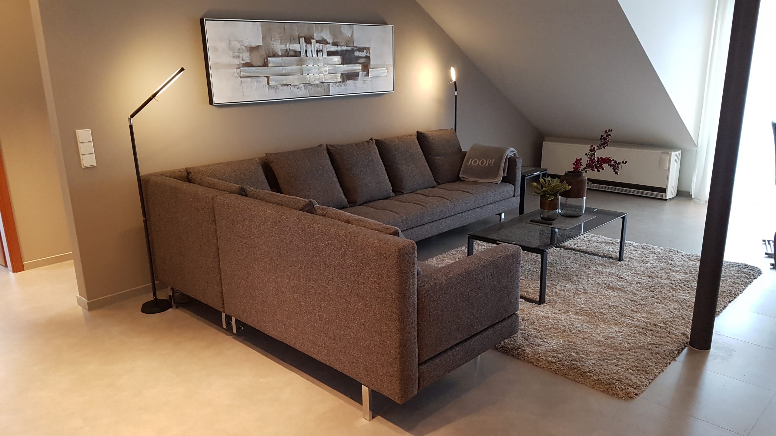Moderne Sitzlandschaft mit Couchtisch, Beistelltisch, Smart TV und Leseleuchten. Große Fensterfront und möblierter Balkon mit Markise für entspanntes Wohnen mit Ausblick.