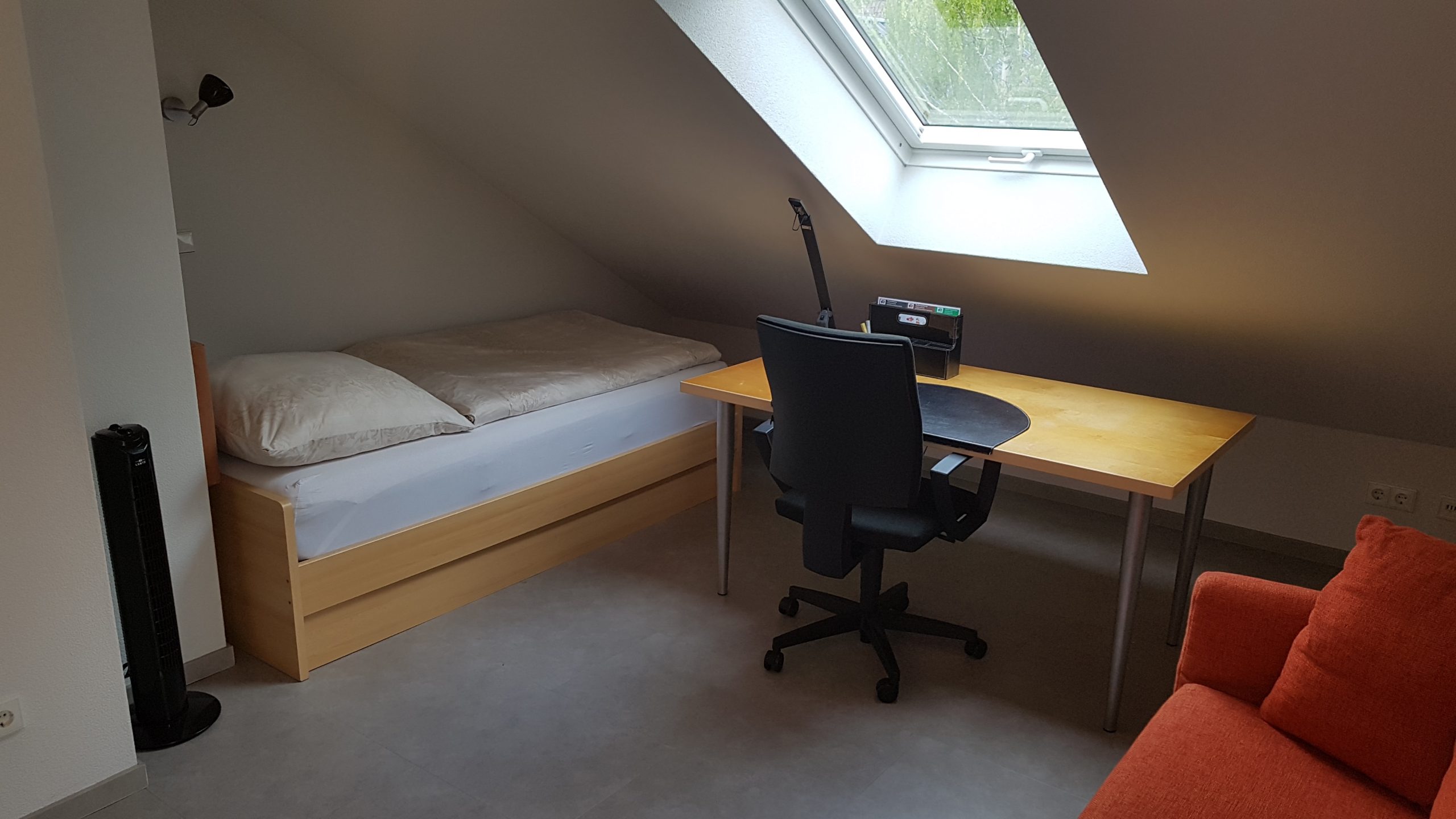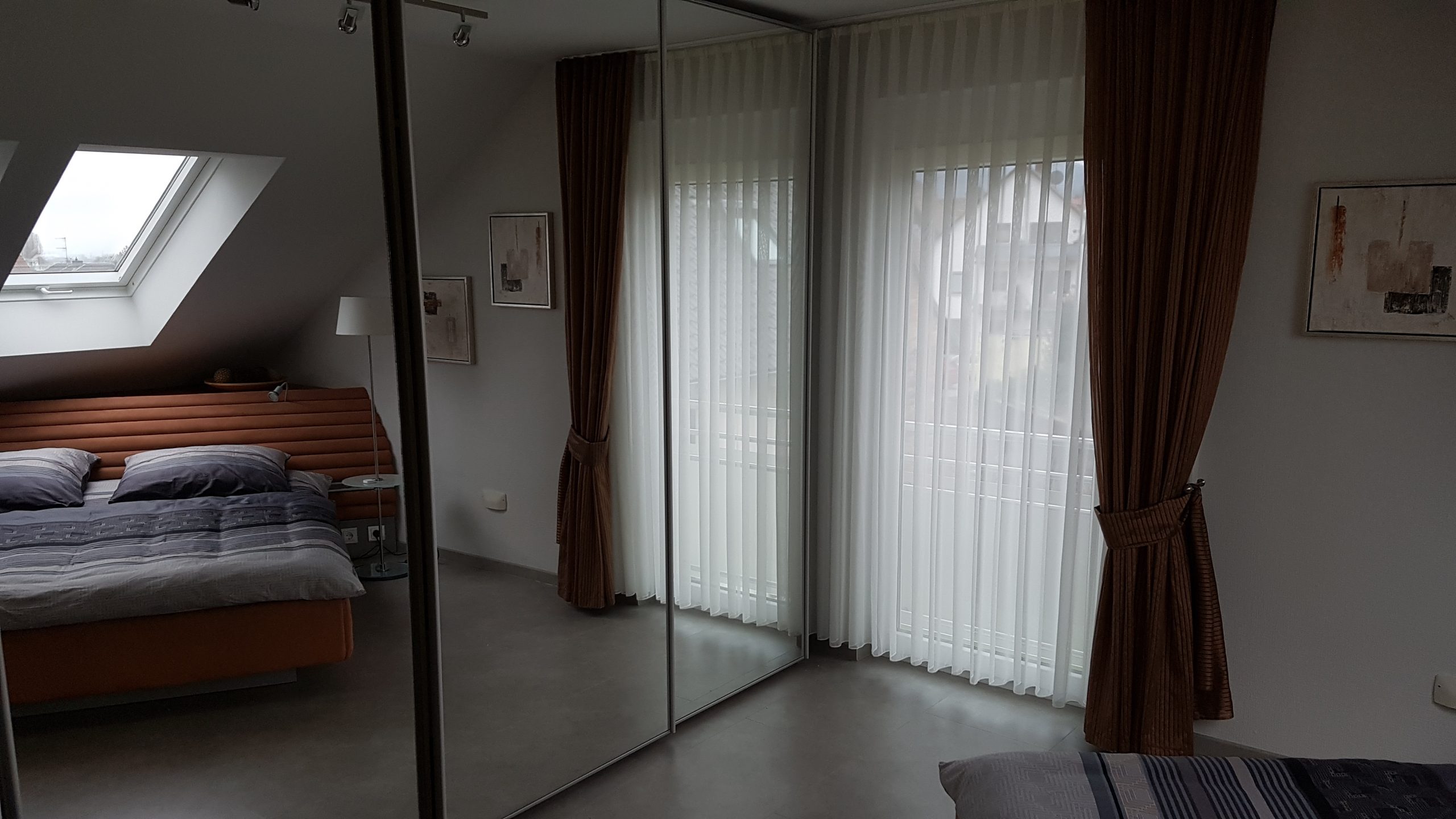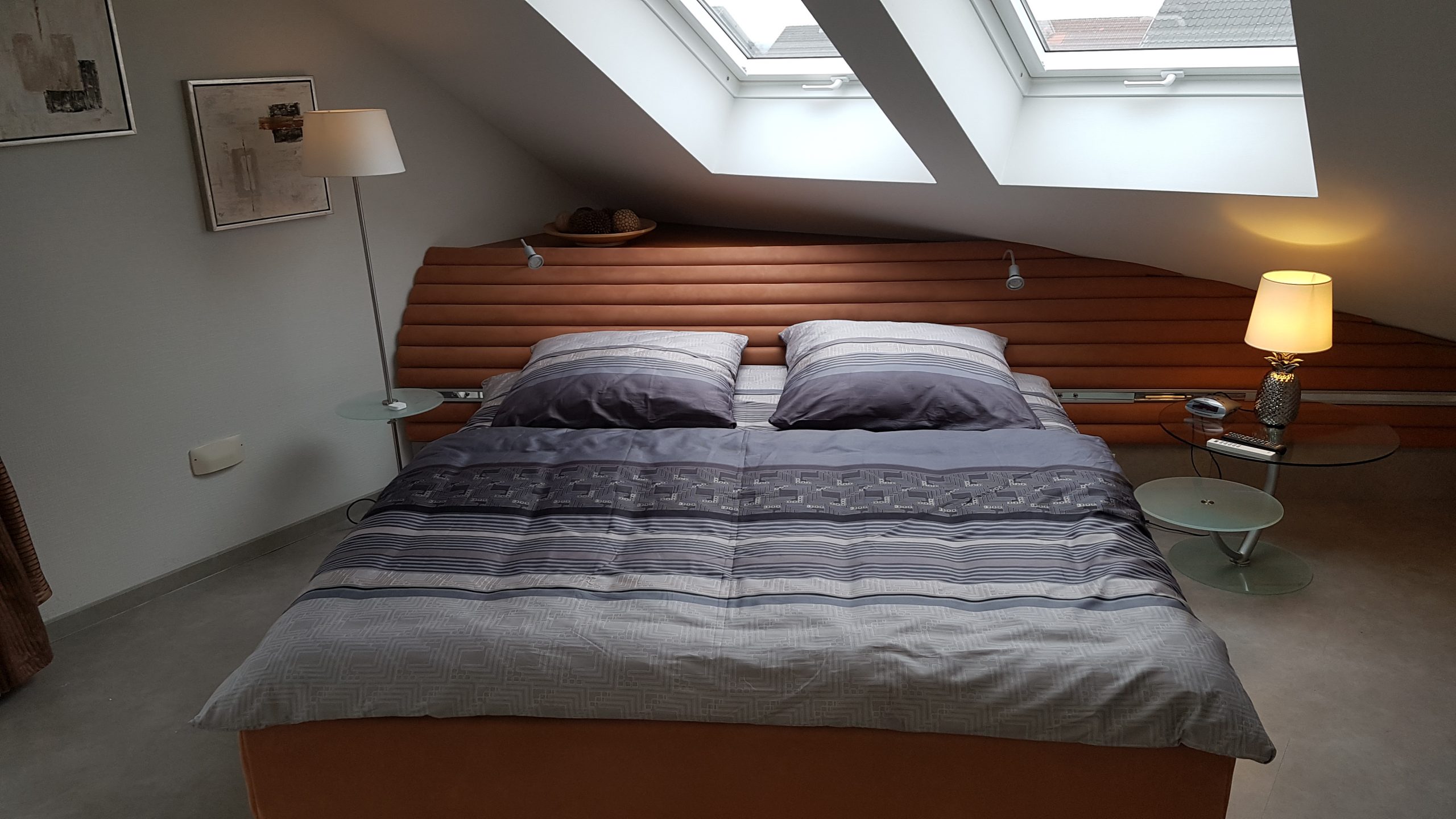Es erwartet Sie ein großzügiges Raumkonzept trotz Dachschräge. Ebenso wurde auf eine optimale Wärmedämmung größten Wert gelegt, so dass in den Sommer- und Wintermonaten ein angenehmes Raumklima herrscht. Die Ferienwohnung ist mit hochwertigen Möbeln ausgestattet und verfügt über ein geräumiges Badezimmer mit Wanne und Dusche sowie eine separate Gästetoilette. Ein großes Schlafzimmer mit Doppelbett 180 cm breit sowie ein 2. Schlafzimmer mit Singlebett 90cm breit und einer Schlafcouch gehören ebenso zur Ausstattung. Der offene Wohn- Essbereich mit integrierter Küche lädt zum verweilen und genießen ein. Der große Balkon mit Blick in die Rheinebene verfügt über eine Markise und bequeme Sessel. Ideal fürs Frühstück im Freien oder lauschige Abende.