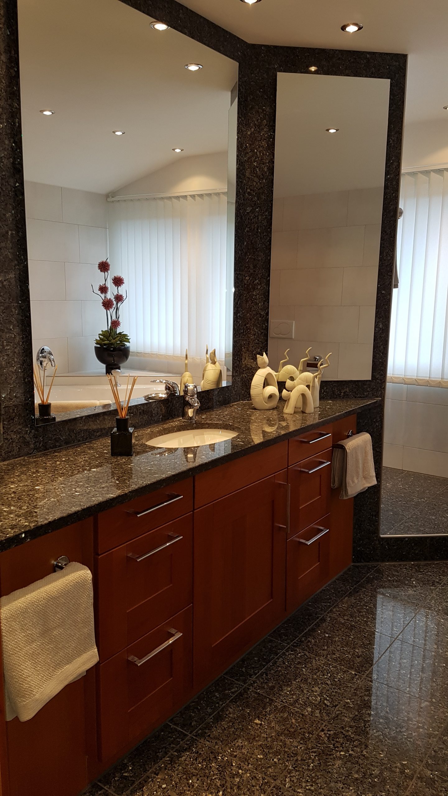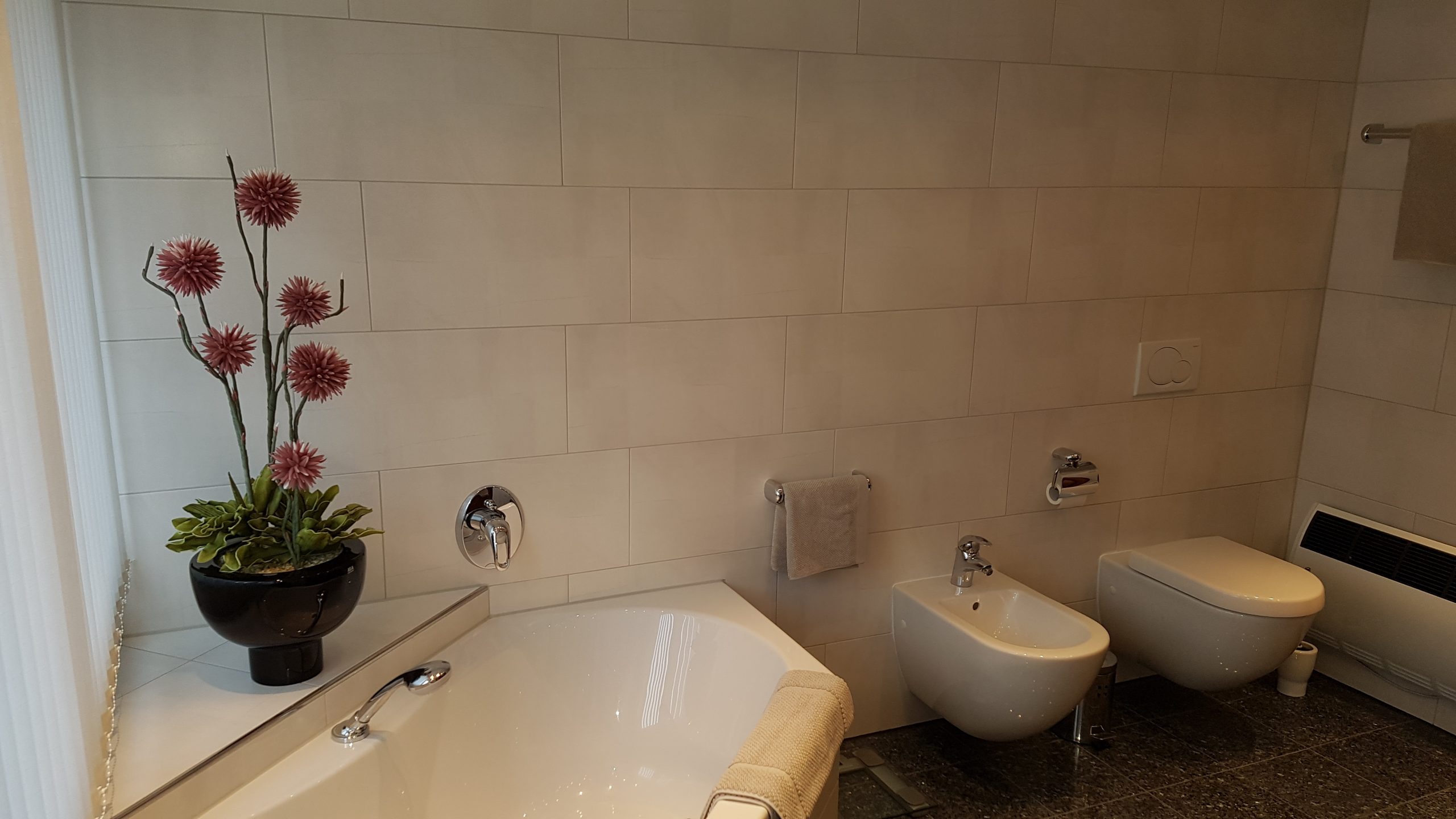Das großzügige Badezimmer bietet eine Badewanne, Walk-in-Dusche, WC und Bidet für höchsten Komfort. Die große Waschtischanlage mit deckenhohen Spiegeln sorgt für viel Platz und eine moderne Atmosphäre.
