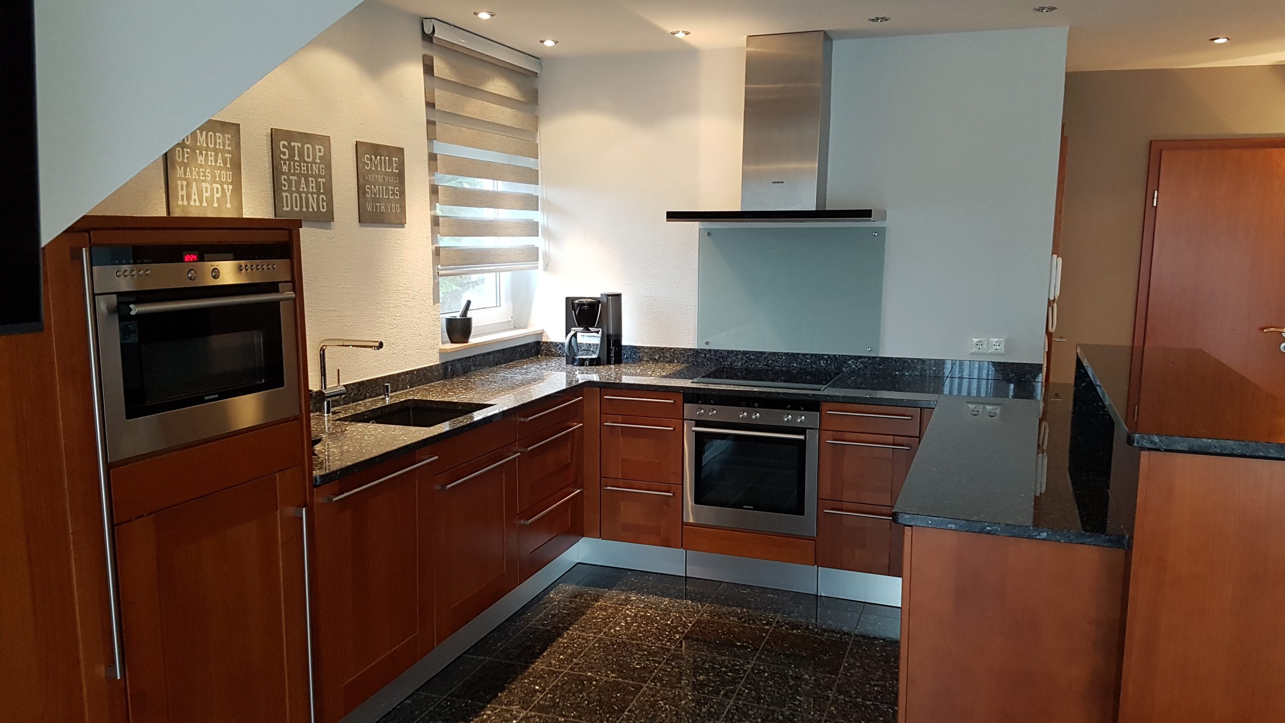 Die moderne Küche ist ausgestattet mit zwei Backöfen, darunter ein Backofen mit integrierter Mikrowelle. Ein Glaskeramik-Kochfeld mit effizientem Dunstabzug sorgt für komfortables und stilvolles Kochen. Der Bartresen mit zwei Barstühlen bildet einen harmonischen Übergang zum Wohnbereich.