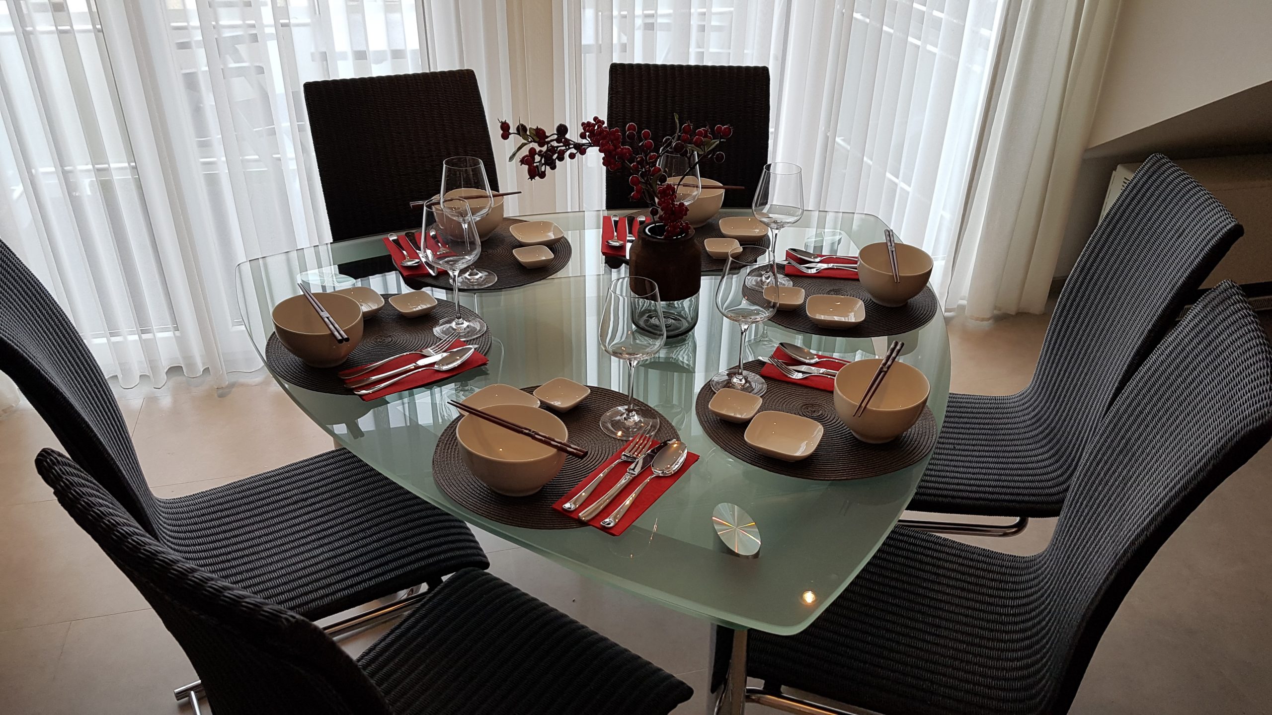 Sie speisen an einem großzügigen Esstisch mit Platz für 6 Personen. Die hochwertigen Freischwinger sorgen für hohen Sitzkomfort und laden zu entspannten Mahlzeiten ein.
