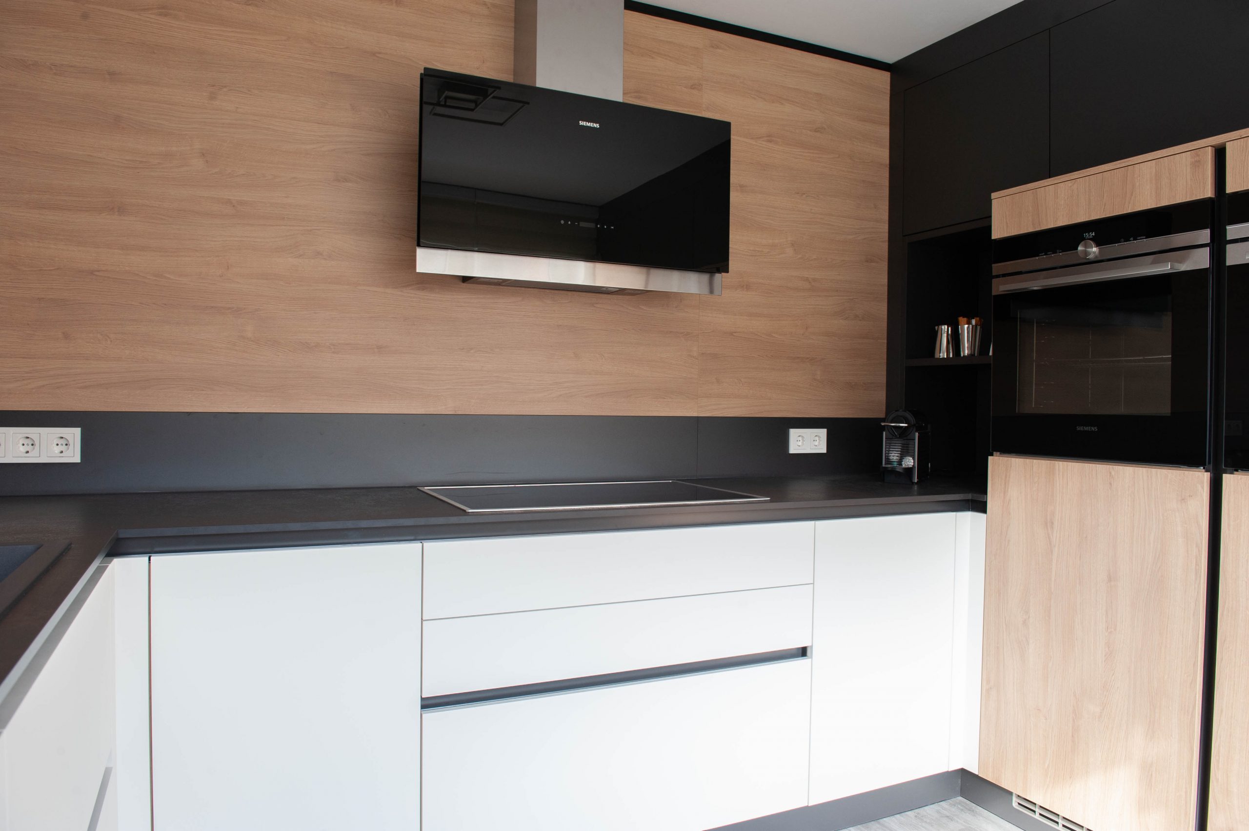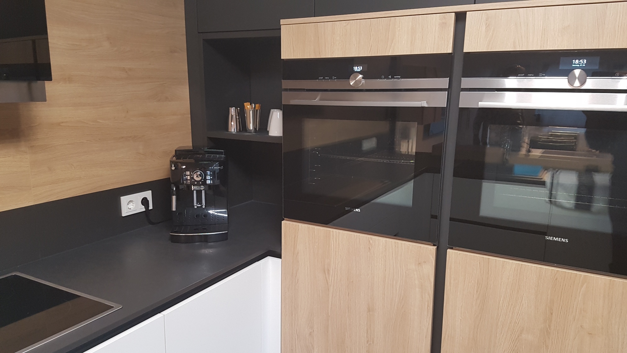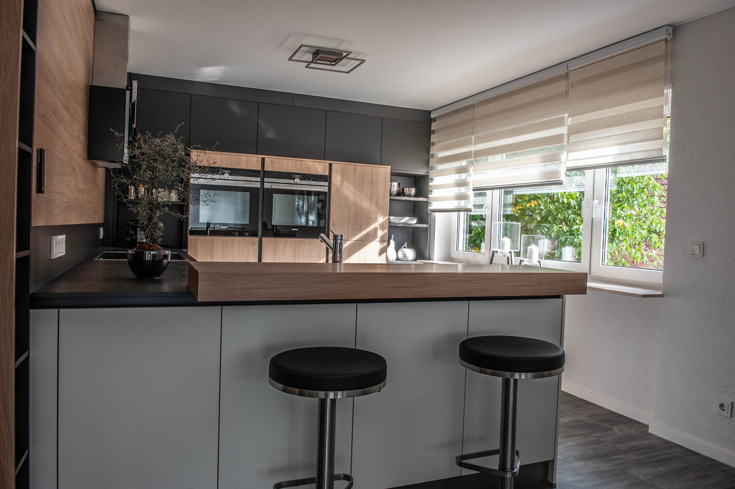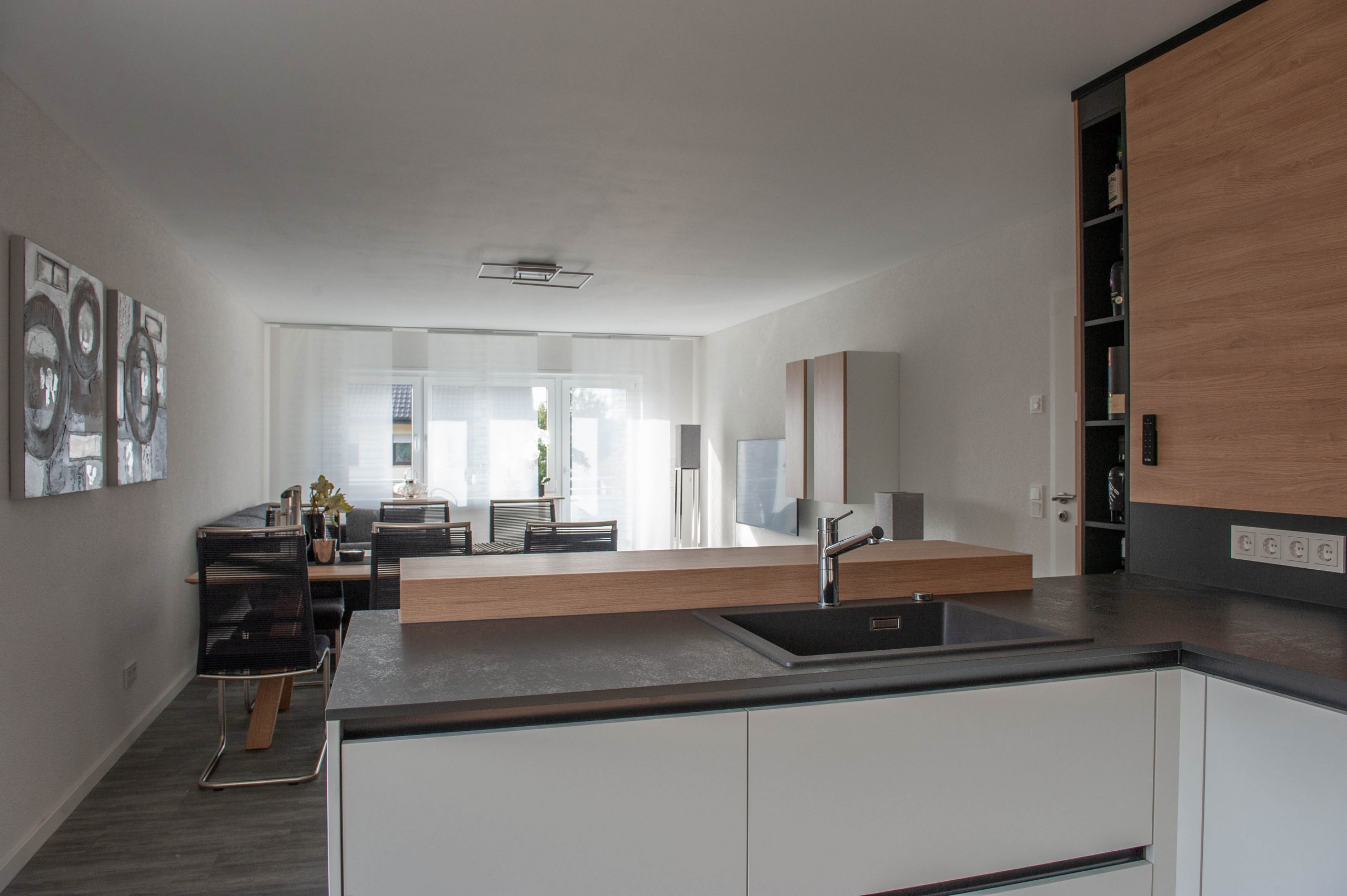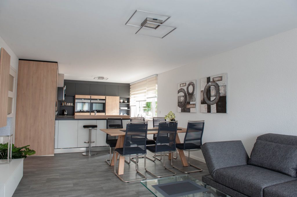 Die moderne Küche ist ausgestattet mit zwei Backöfen, darunter ein Backofen mit integrierter Mikrowelle. Ein Glaskeramik-Kochfeld mit effizientem Dunstabzug sorgt für komfortables und stilvolles Kochen. Der Bartresen mit zwei Barstühlen bildet einen harmonischen Übergang zum Wohnbereich.