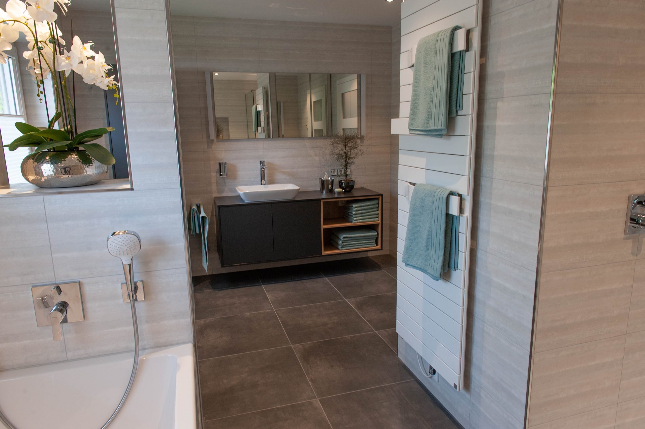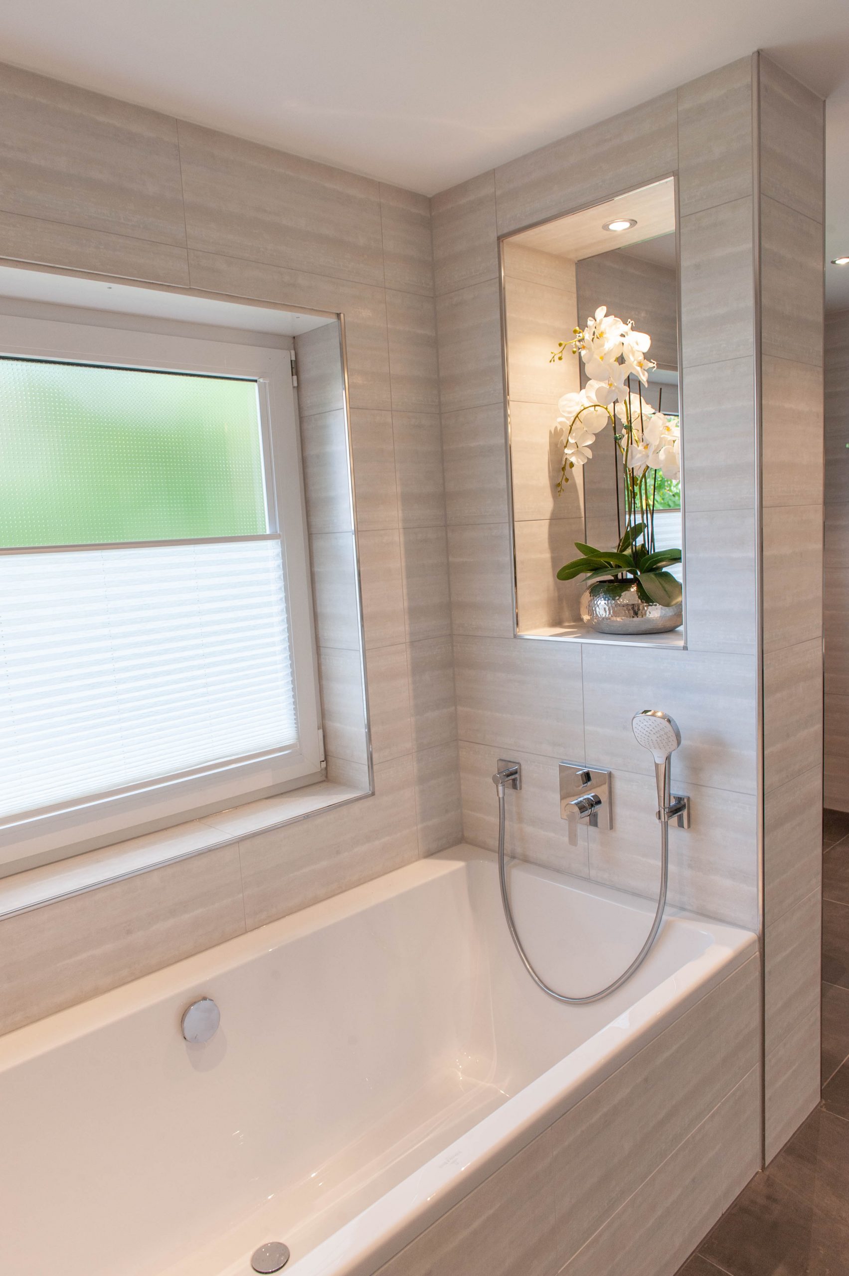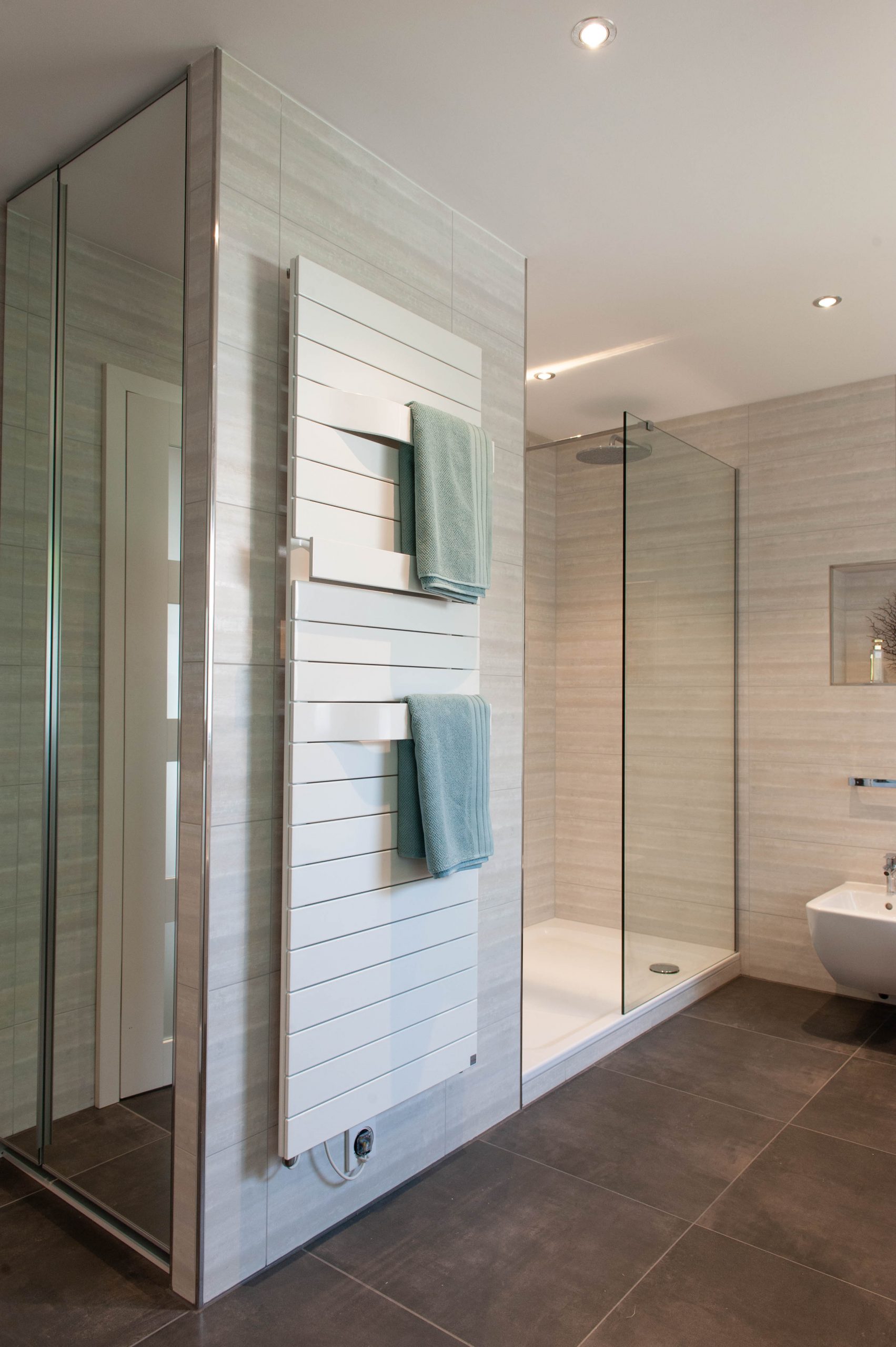 Das großzügige Badezimmer bietet eine Badewanne, Walk-in-Dusche, WC und Bidet für höchsten Komfort. Die große Waschtischanlage mit deckenhohen Spiegeln sorgt für viel Platz und eine moderne Atmosphäre.