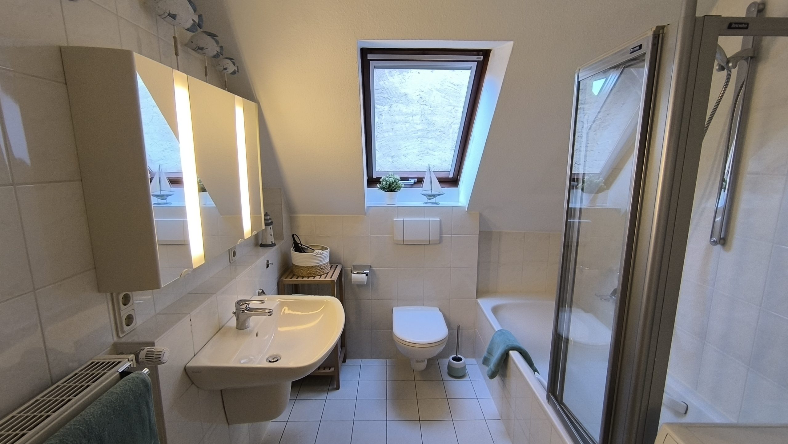 Das großzügige Badezimmer bietet eine Badewanne, Walk-in-Dusche, WC und Bidet für höchsten Komfort. Die große Waschtischanlage mit deckenhohen Spiegeln sorgt für viel Platz und eine moderne Atmosphäre.