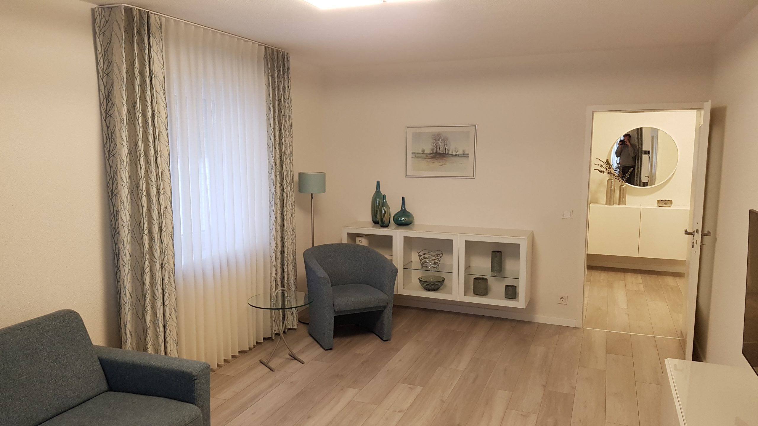 Moderne Sitzlandschaft mit Couchtisch, Beistelltisch, Smart TV und Leseleuchten. Große Fensterfront und möblierter Balkon mit Markise für entspanntes Wohnen mit Ausblick.