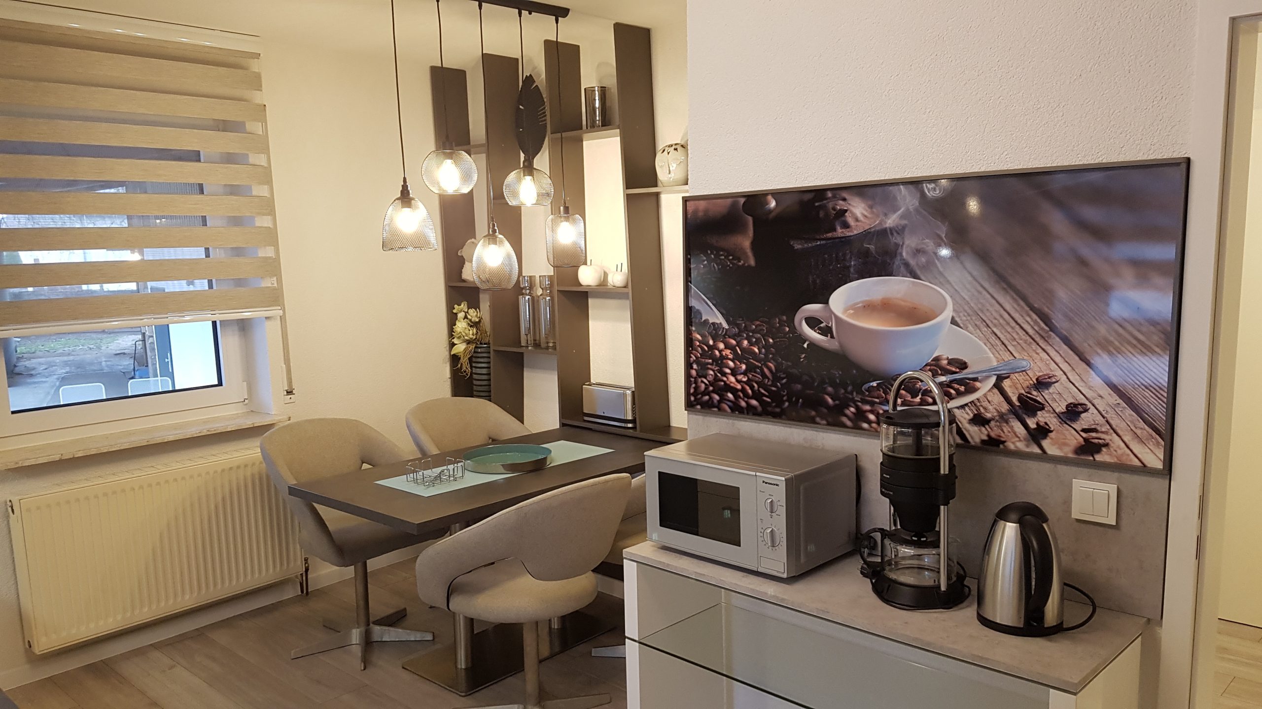 Geräumige Ferienwohnung im Zentrum von Hirschberg. Die Wohnung verfügt über ein Wohnzimmer mit gemütlichen Sitzmöbeln. Das Sofa mit Relaxliege lässt sich in ein zusätzliches Bett verwandeln und bietet für 2 Personen Platz. Ein großer Smart TV gehört ebenso zur Ausstattung. Das Schlafzimmer ist mit einem Doppelbett 180 cm Breit und einem Kleiderschrank eingerichtet. Durch die Diele gelangen Sie in das mit einer Wanne ausgestattete Badezimmer. In der Küche finden Sie alles was man für einen angenehmen Aufenthalt benötigt. Die kleine gemütliche Essecke unterstreicht das elegante Ambiente. Nehmen Sie in den komfortablen Sesseln platz und genießen Sie den Kaffee oder ihre zubereiteten Malzeiten.