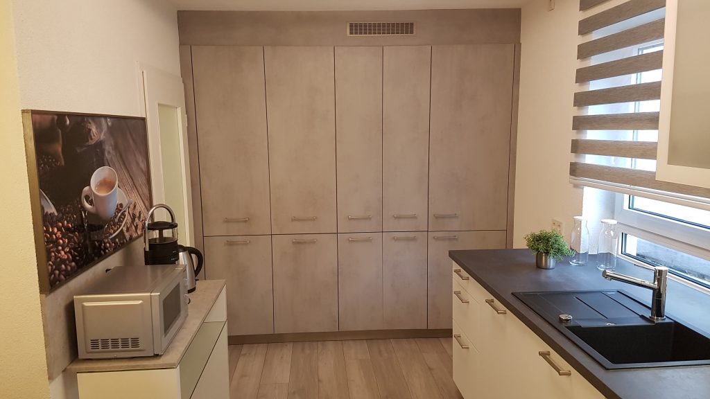 Die moderne Küche ist ausgestattet mit zwei Backöfen, darunter ein Backofen mit integrierter Mikrowelle. Ein Glaskeramik-Kochfeld mit effizientem Dunstabzug sorgt für komfortables und stilvolles Kochen. Der Bartresen mit zwei Barstühlen bildet einen harmonischen Übergang zum Wohnbereich.